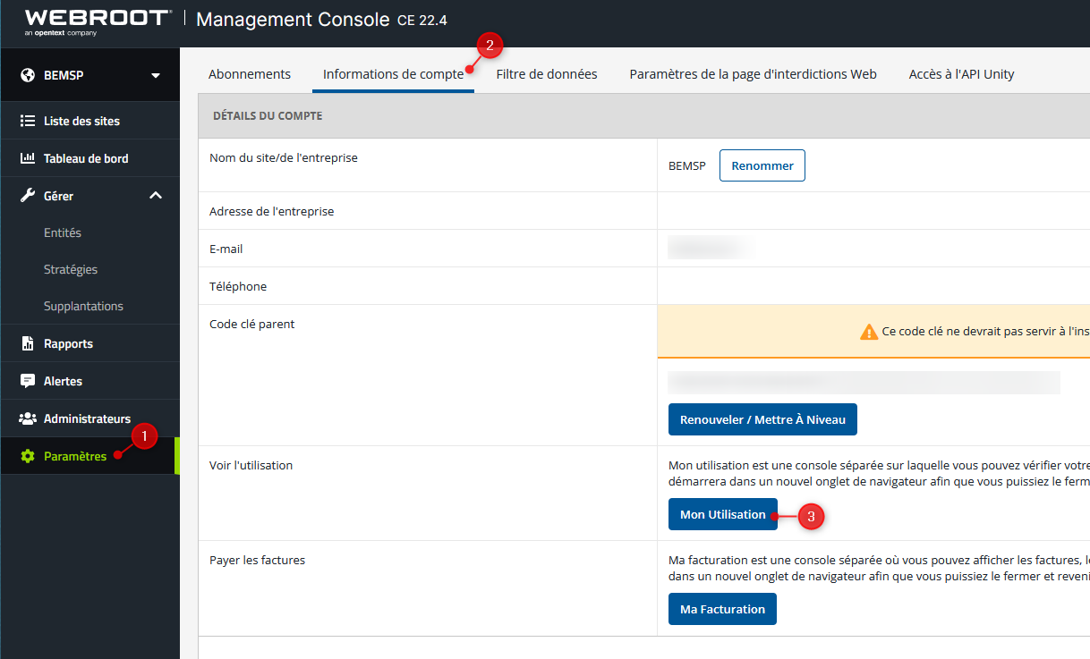 Cet article vous indique les étapes à suivre dans la console Webroot pour voir le détail de votre facturation Webroot.