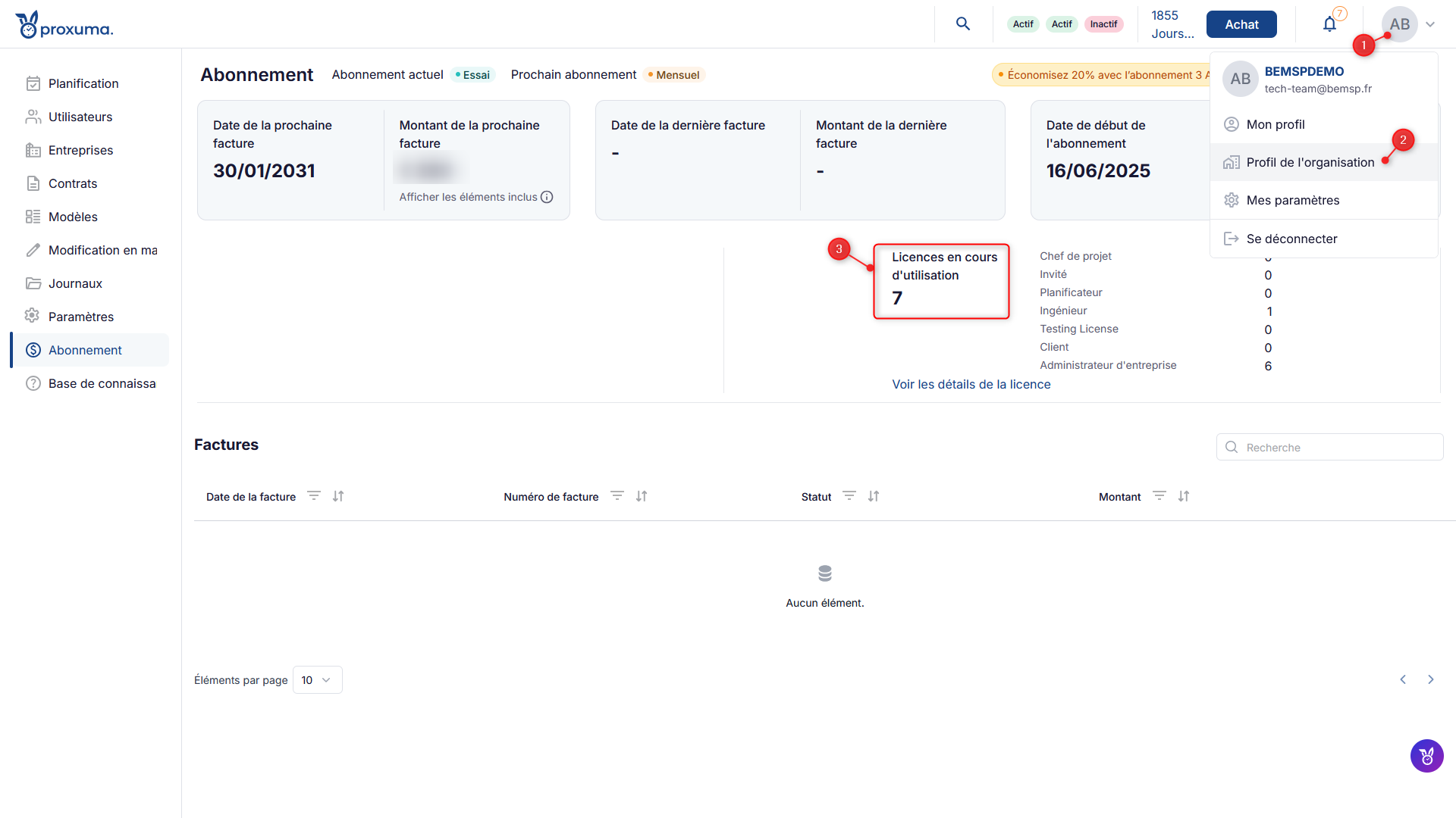 Cet article vous indique les étapes à suivre pour connaître le nombre de licences au sein de Proxuma.