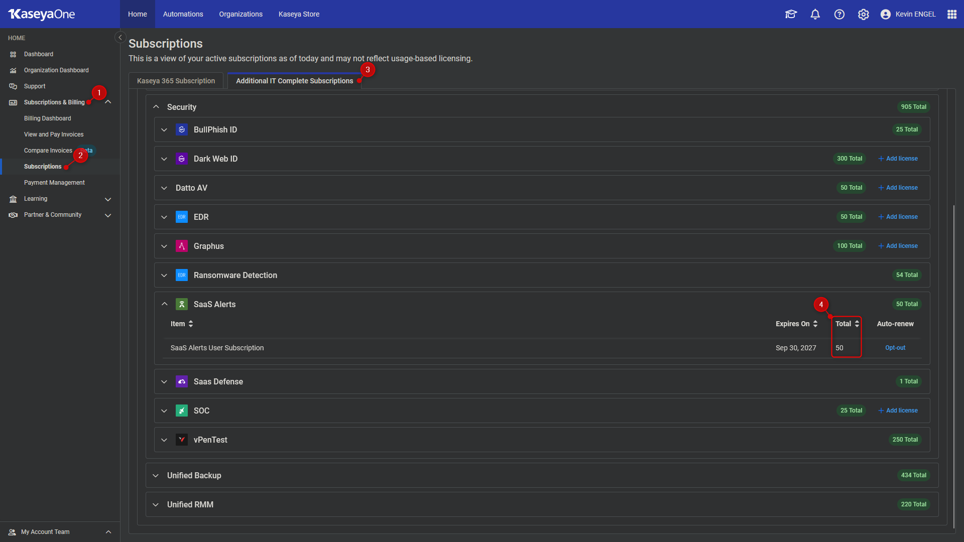 Depuis KaseyaOne, Dans le menu Subscriptions & Billing puis Subscription, dans la partie SaaS Alerts :