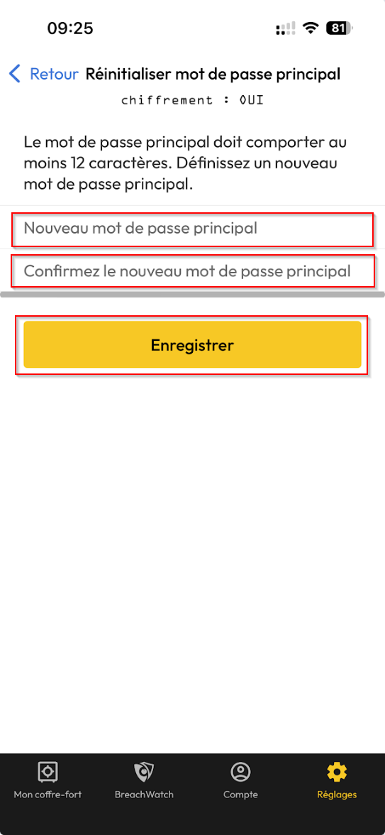 Aller dans Réglages > Réinitialiser mot de passe principal
